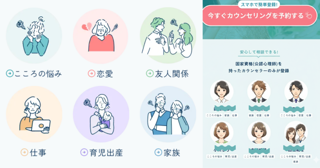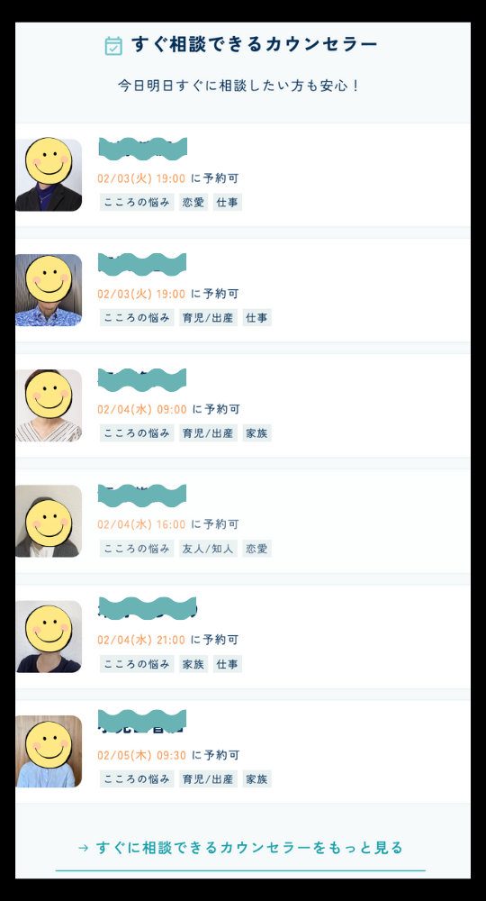 国家資格(公認心理師)を持ったカウンセラーの中から、顔やプロフを見て選ぶことができます!カウンセラーたちは得意な分野を明記しているから選びやすい!